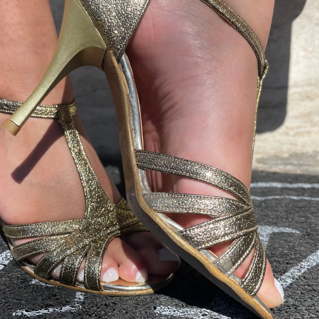 Presentamos las sandalias Berlín. Las hacemos con un taco de 8,5 Cm que realza tu figura sin sacrificar comodidad. Con una suela de cromo que garantiza un buen deslizamiento, evitando resbalones y frenadas. Tanto su plantilla interna y forro interno están confeccionados en cuero vacuno y sus piezas de corte de cabritilla transfer oro asegurando una larga durabilidad y suavidad en cada paso. El diseño con "tira en T", te da un agarre único y mucha seguridad al bailar.